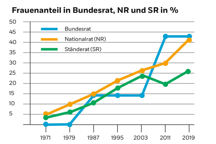 Po ostatnich wyborach w 2019 r w udział kobiet w parlamencie narodowym wzrósł do najwyższego w historii, 42% udziału. 26% kobiet zasiada w Radzie Kantonów.